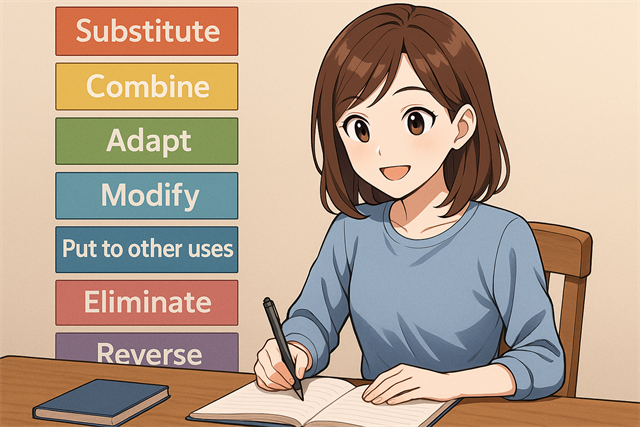 ここで役立つのがSCAMPER法です。この手法は、すでに存在するものを7つの視点で見直すことで、思考の枠を外し、可能性を広げます。ゼロベースでの発想が苦手な人でも、問いに沿って考えるだけで自然と新しい方向性を見つけられるのです。