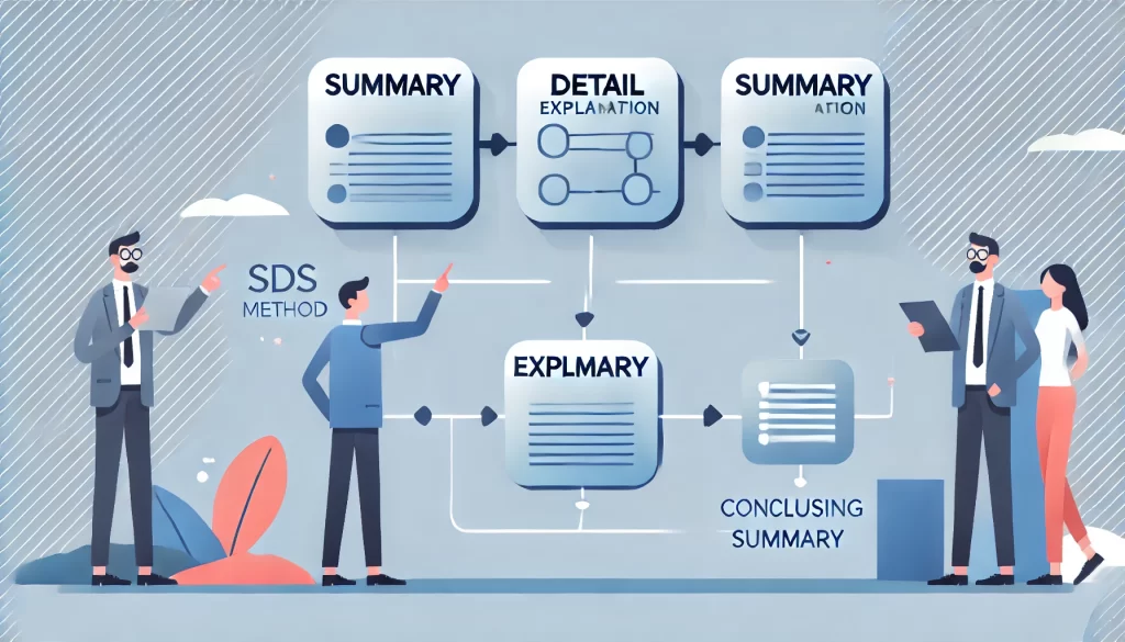 情報をわかりやすく伝えるためには、構成が重要です。いくら内容が優れていても、順序がバラバラでは相手に伝わりづらくなります。そんな時に役立つのが「SDS法」というシンプルで効果的な文章構成術です。SDS法は「要約(Summary)→ 詳細(Detail)→ 要約(Summary)」の流れで情報を伝える方法で、プレゼンテーションやビジネス文書、教育現場などで広く活用されています。